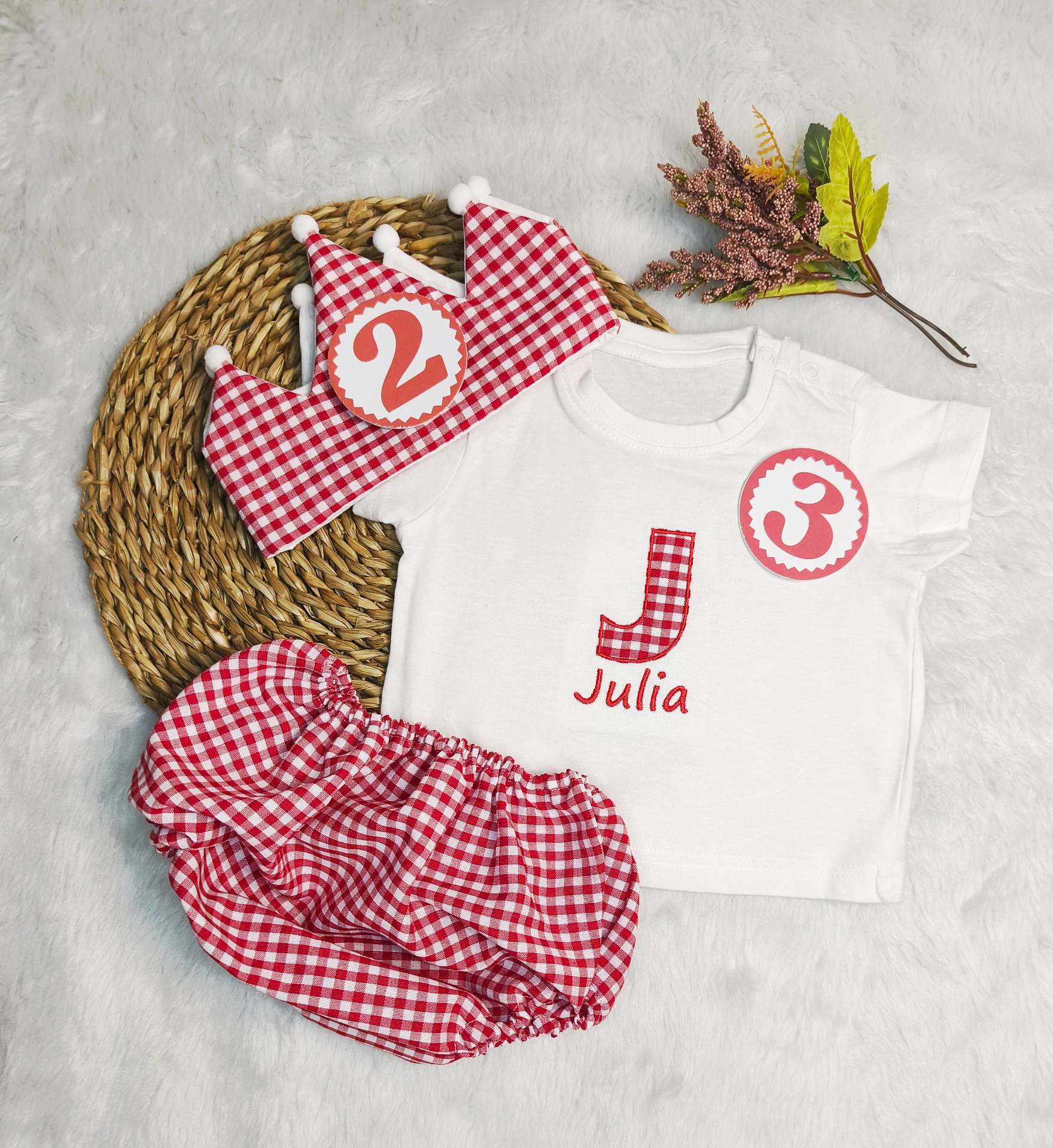Conjunto de cumpleaños. Modelo vichy 0.60cm CORONA+CUBRE PAÑAL SIMPLE + CAMISETA PERSONALIZADA 36,00 € 0,00 €